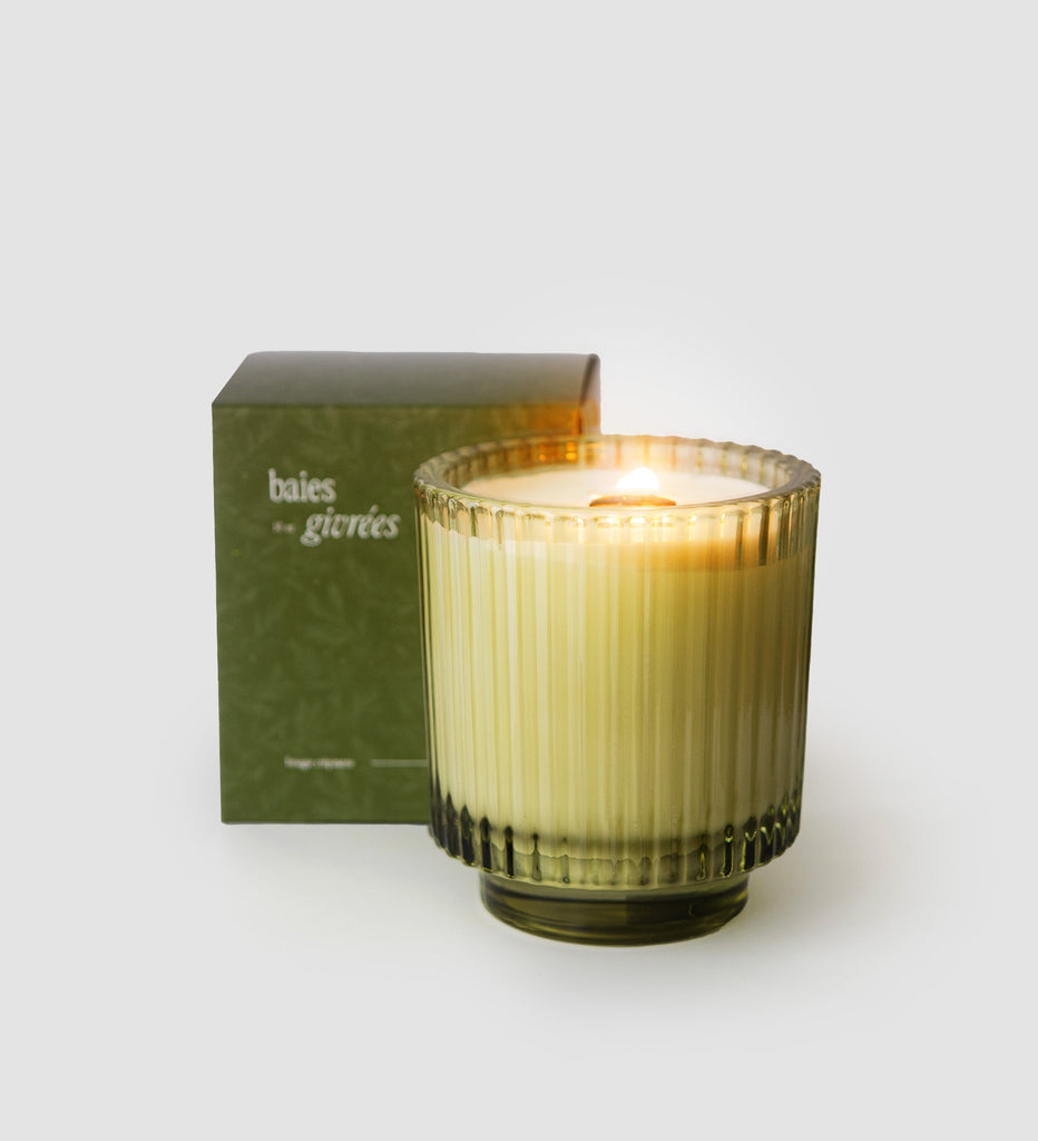 Cette bougie renferme tout le réconfort de la saison, qu’elle libère peu à peu à travers la lumière qui danse dans son verre nervuré. Sa mèche de bois s’enflamme doucement, offrant un crépitement apaisant et un parfum à la fois fruité et boisé, où le cèdre frais et le sapin se marient aux baies d’hiver au cœur de la fragrance.